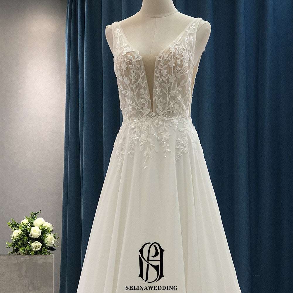 New Sleevesless Floral Decorative V-neck Wedding Dress selina202241803
