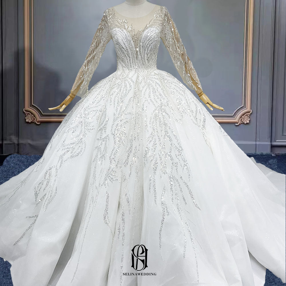 2023 Women's Lace Tulle Lace Long Sleeves A-line Wedding Dresses for Bride with Train Wedding Appliques Selina202342709