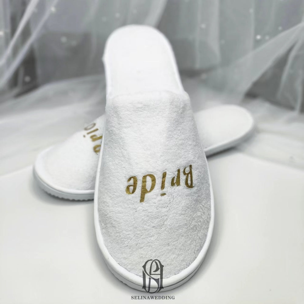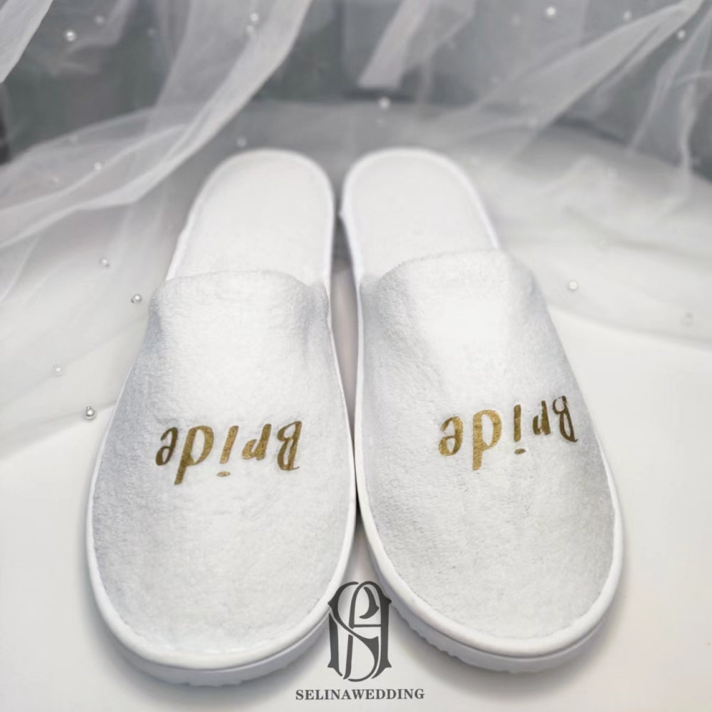 - WEDDING SLIPPERS: Get ready in style on your big day with these lovely white wedding slippers with gold print
