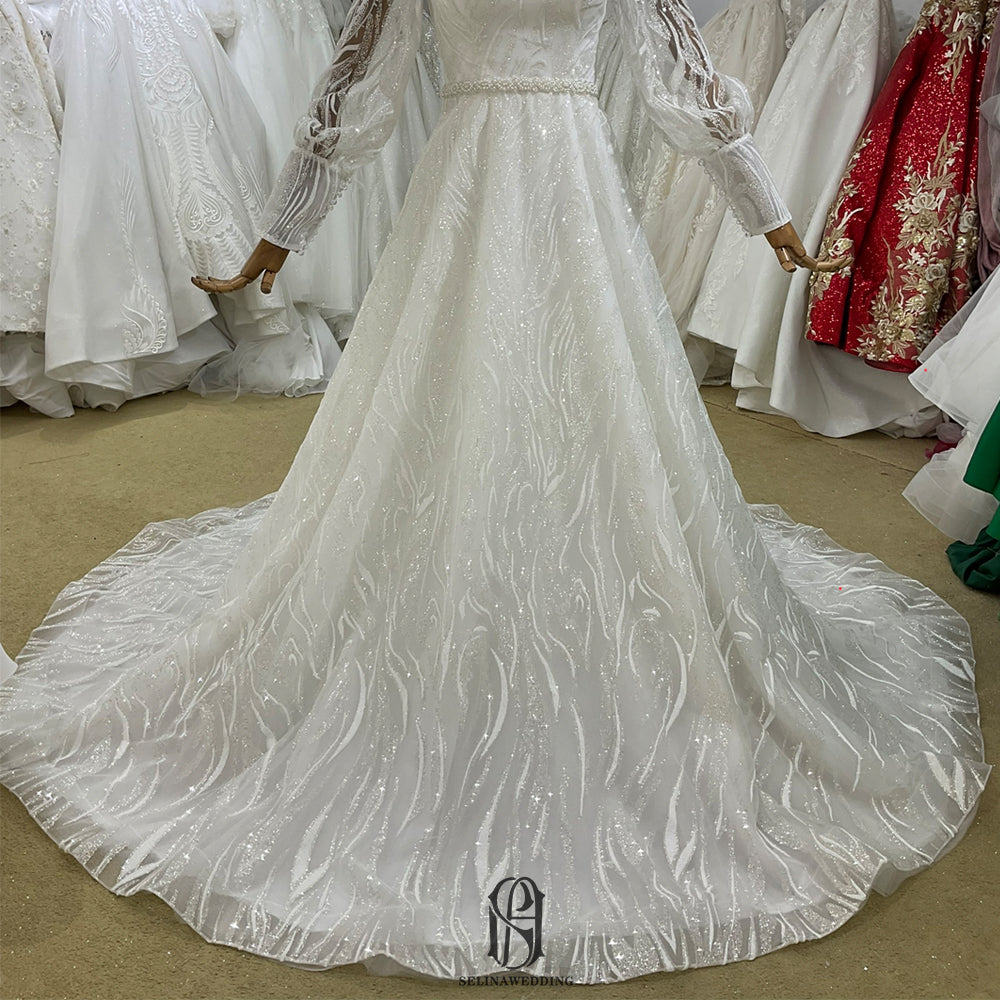 2022 Lace Wedding Dress Long Puff Sleeves Round-neck selina202206243