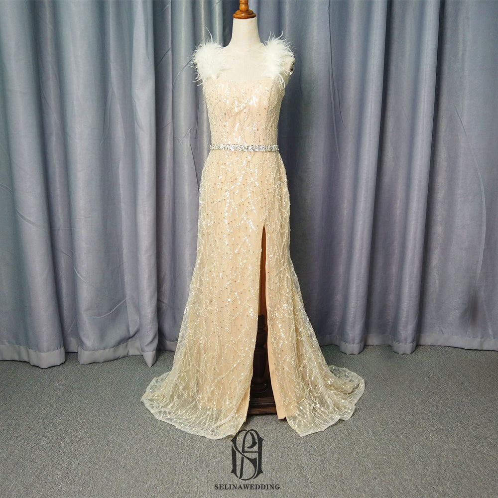 Champagne Prom Dresses Long A Line Formal Evening Ball Gowns Side Slit Glitter Party Dress with sequins selina202271912
