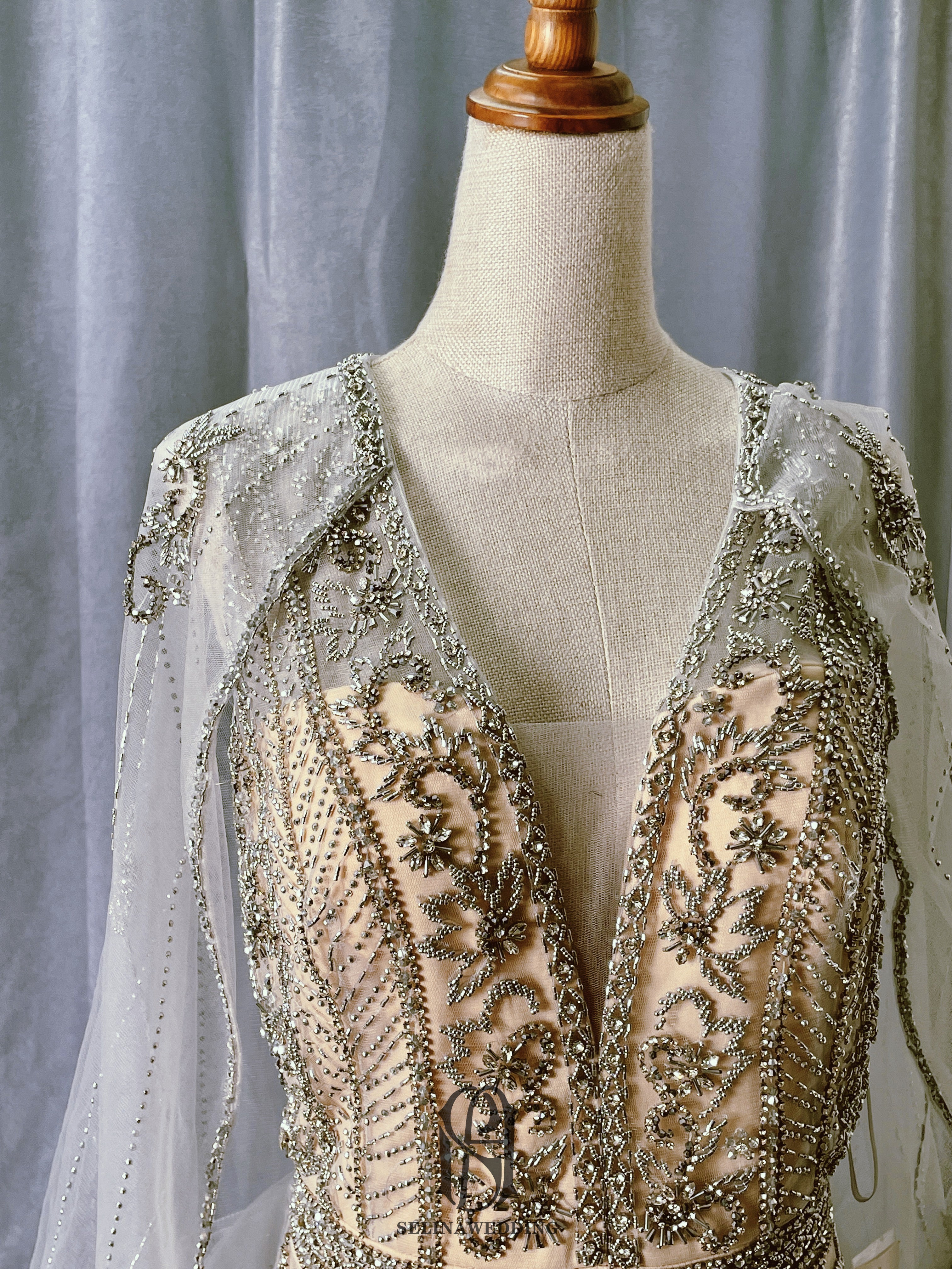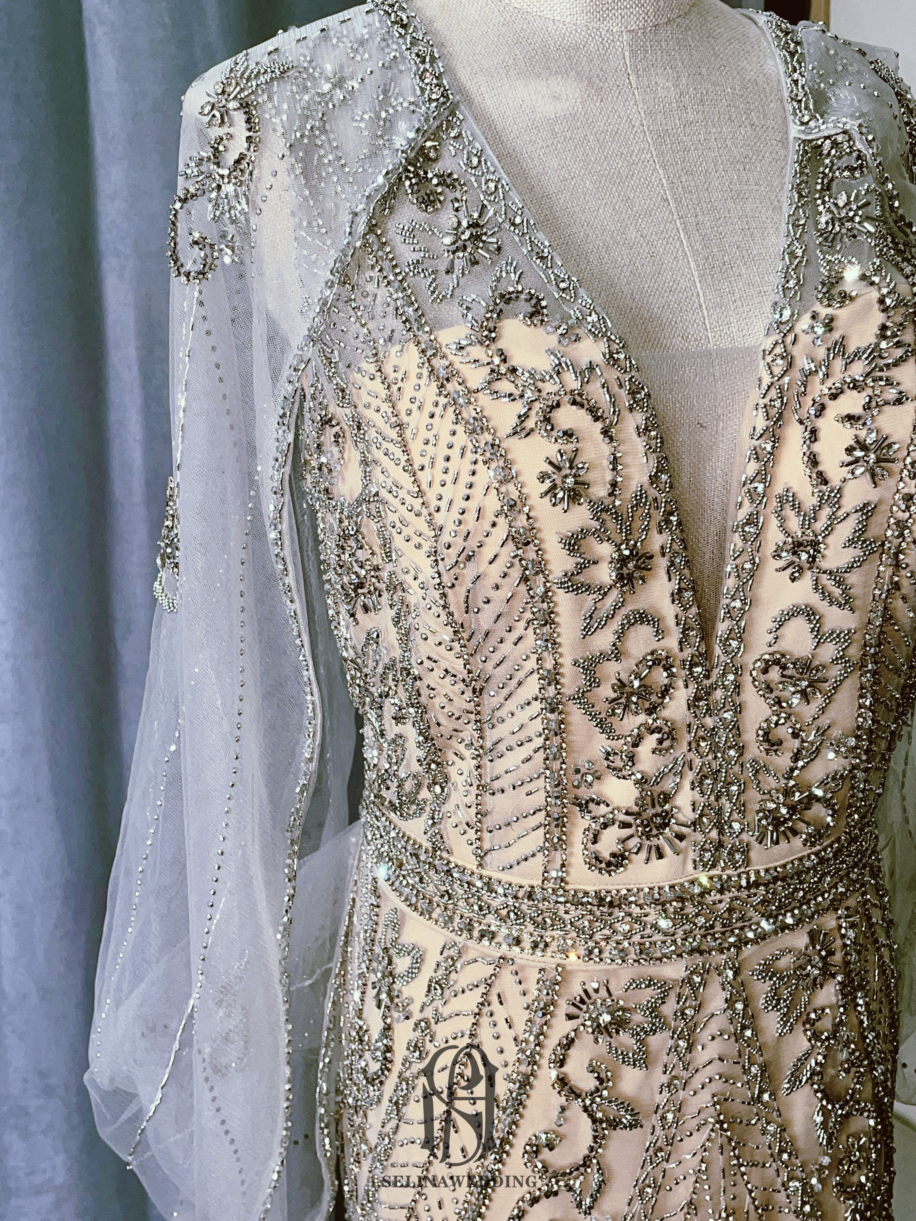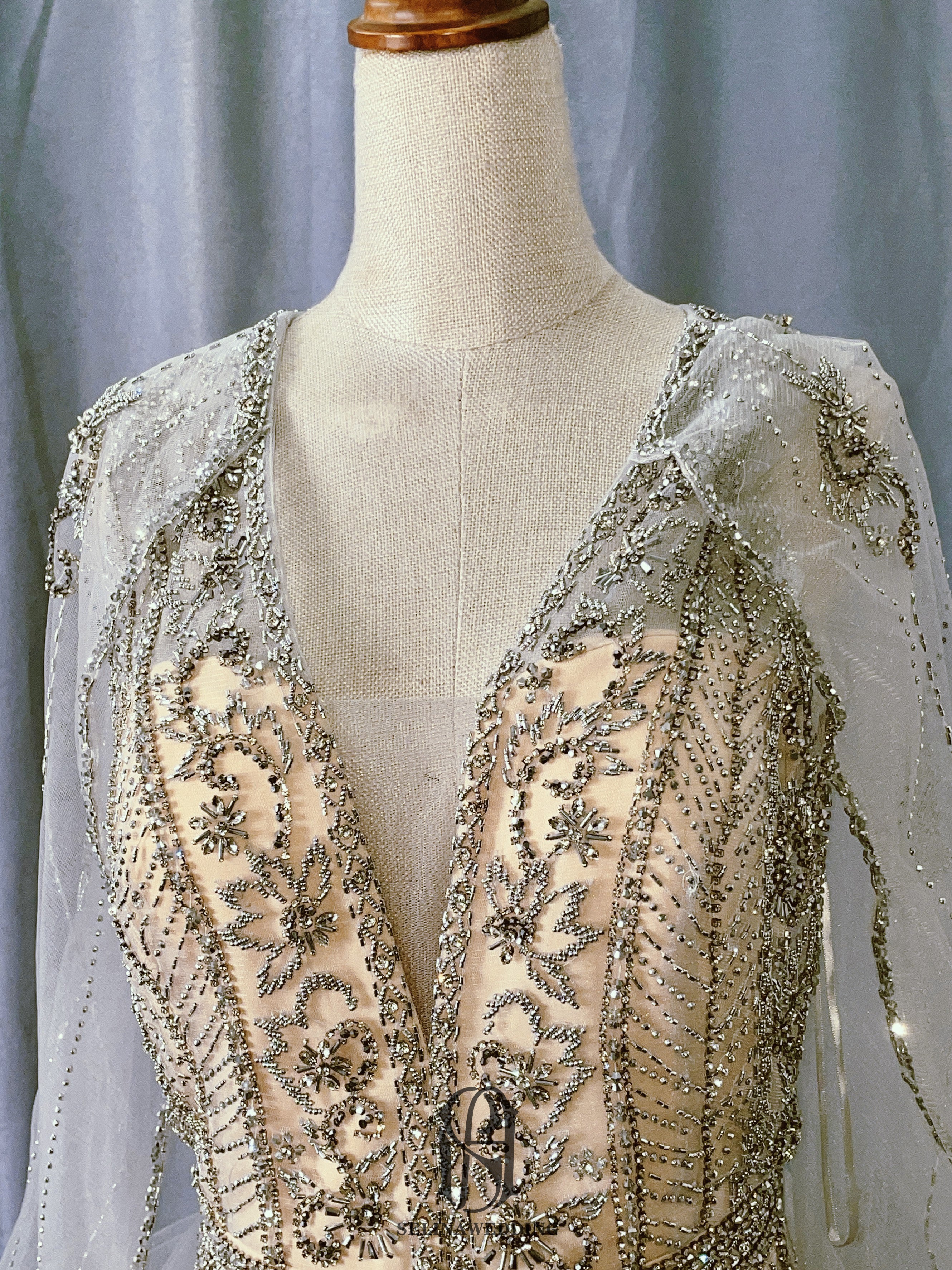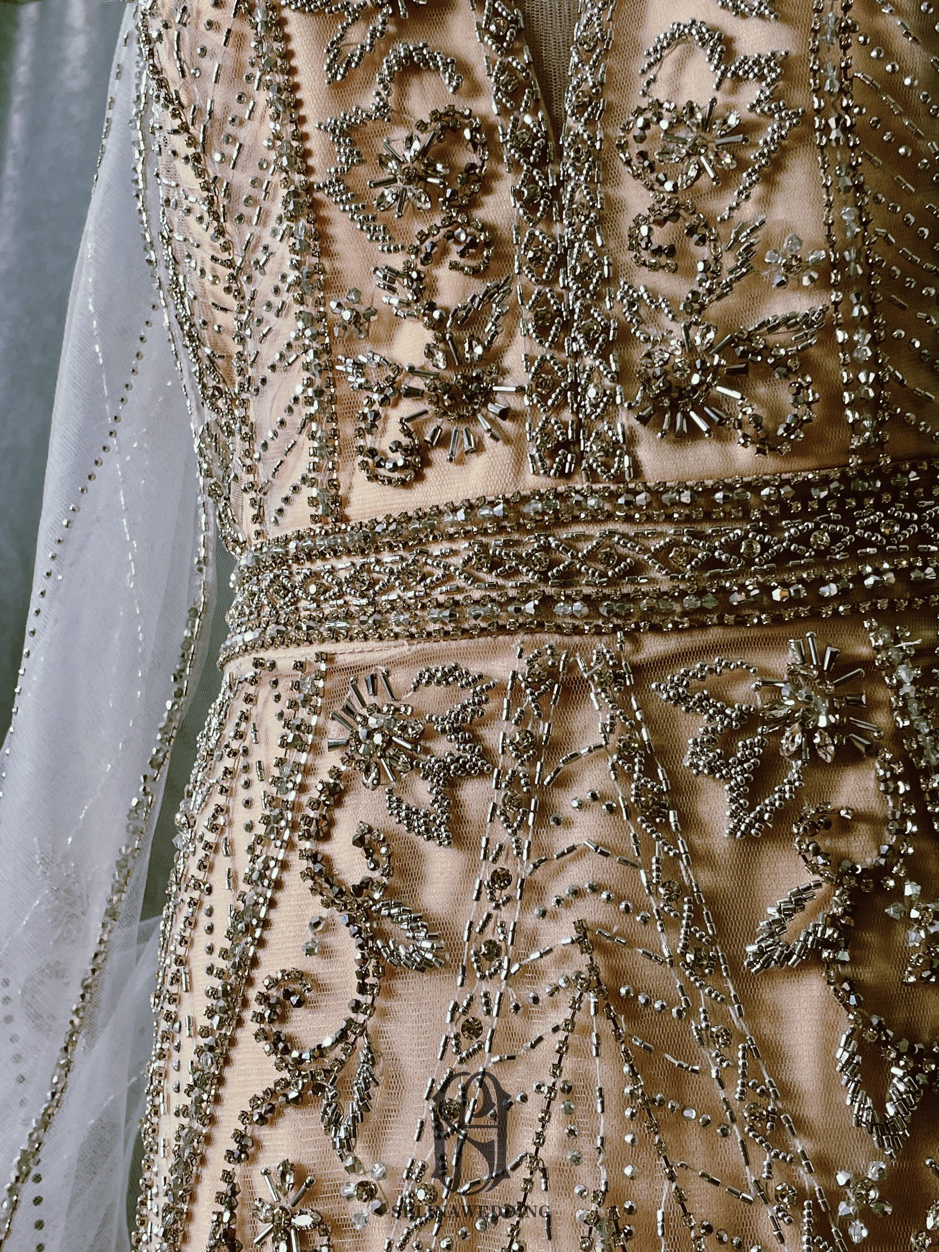 The dress is embellished with intricate beadwork, adding a touch of sparkle and glamour. The Cairo Nights color is a deep and luxurious blue, evoking the mystery and romance of the night sky.